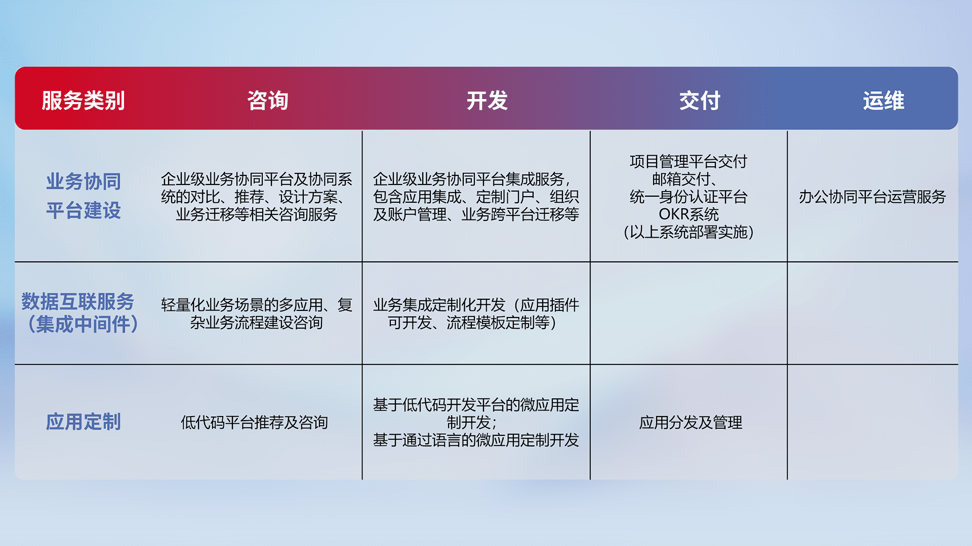 针对钉钉、、、企微、、、IDaas等平台级产品提供产品的规划、、、、方案、、交付、、、、定制化开发等服务,,实现如统一协同办公、、、、智能客户服务、、、混合会议管理、、、、智能数据查询、、、等业务场景,,,实现数字化转型。。。。